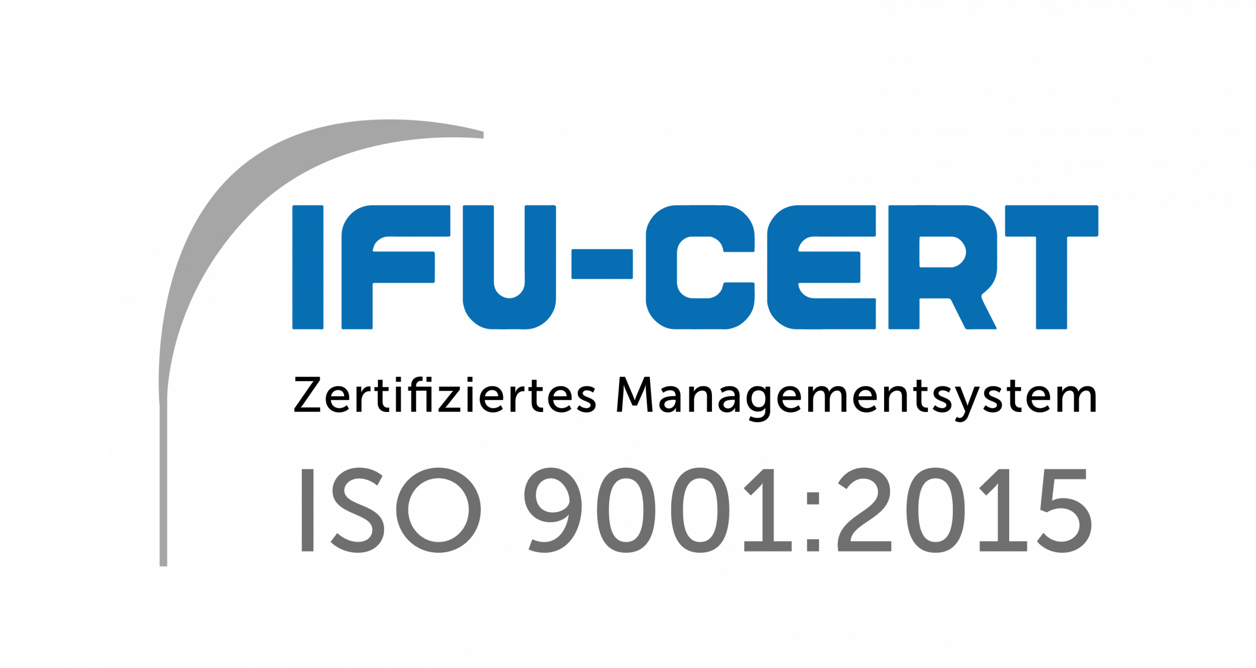 Unser Unternehmen ist nach ISO 9001:2015 durch IFU-CERT zertifiziert. Dieses international anerkannte Qualitätsmanagementsystem steht für strukturierte Prozesse, hohe Kundenzufriedenheit und kontinuierliche Verbesserung.